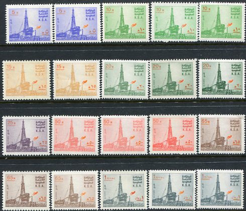 Saudi Arabia: 1982 – 1983. Redrawn Al Khafji Oil Rig definitives unmounted mint set with perforation, watermark and paper varieties. All different. Mi. 732A/745D, Sg. 1306/1325