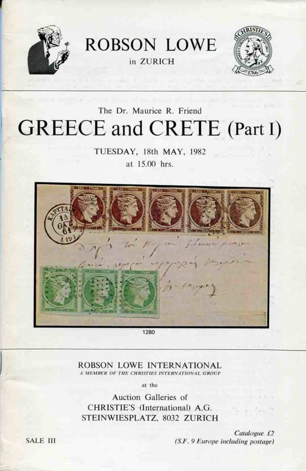 Auction Catalogue: GREECE and CRETE (Part I). The Dr. Maurice R. Friend collection, 1982, Robson Lowe, 341 lots, colour and b&w illustrations with price realized.