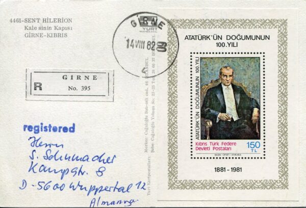 Turkish Cyprus: 1982 (14 August). Registered postcard to Germany franked with birth centenary of Ataturk miniature sheet tied by Girne datestamp.