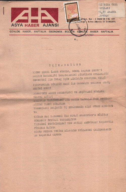 Turkish Cyprus: 1982 (20 September). Asya Haber Ajansi five pages stapled daily newspaper posted in Lefkosa (Nicosia) franked with 1tl Islam Federation stamp. Very rare.