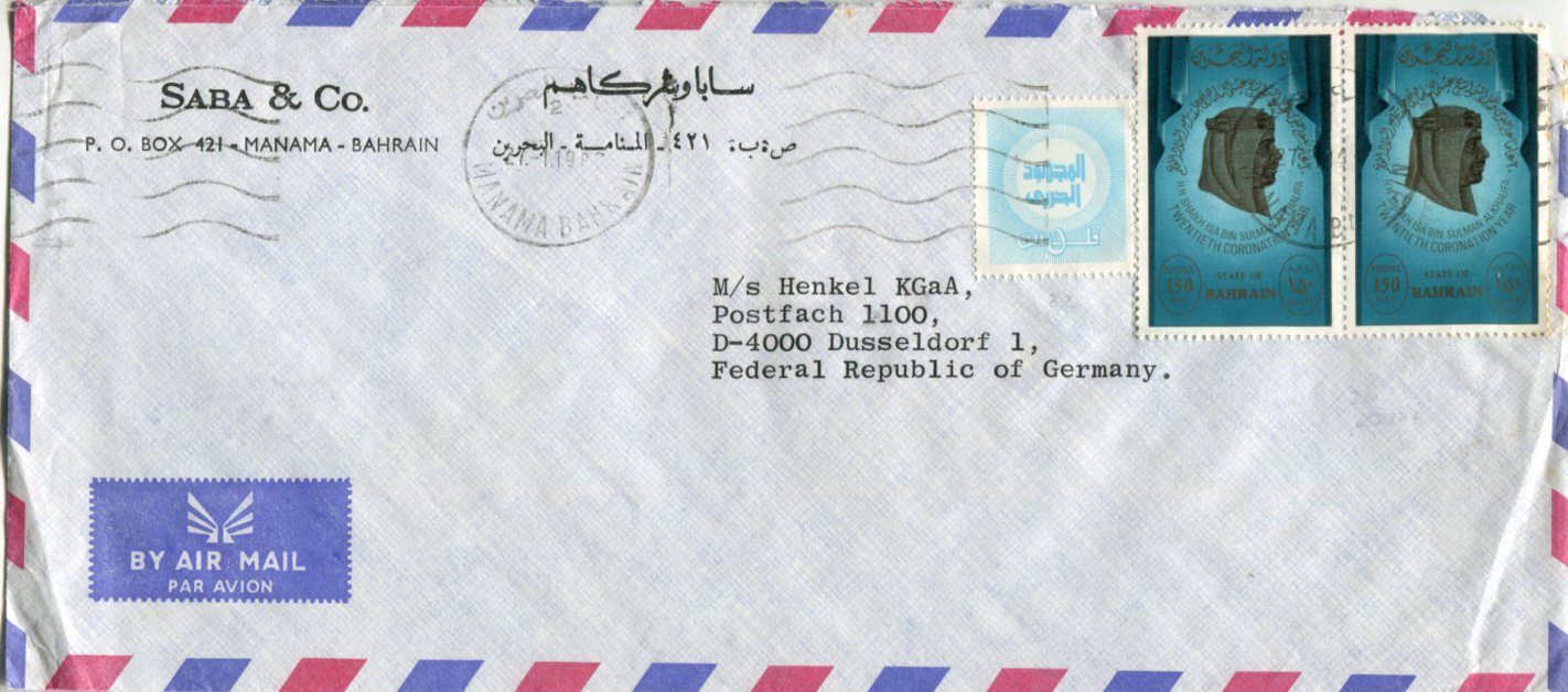 Bahrain: 1983 commercial cover to Germany franked with pair of 150f Shaikh Isa bin Salman portrait and 5f war tax stamps tied by Manama datestamps. Sg. 294