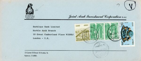 Egypt: 1983 Joint Arab Investment Corp. imprinted falcon logo cover to Barclays Bank, London.