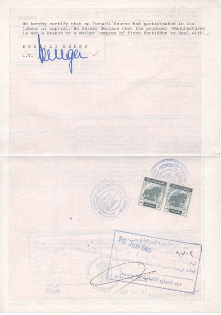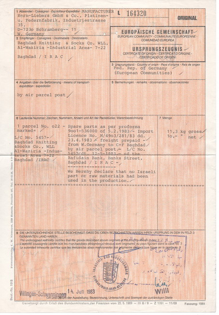 Iraq: 1983 certificate of origin and declaration of no Israeli part of raw materials had been used in production document from Germany franked on reverse with pair of 5d Lion of Babylon revenue stamps tied by Iraq Embassy, Bonn cachet. Ross & Powell 327