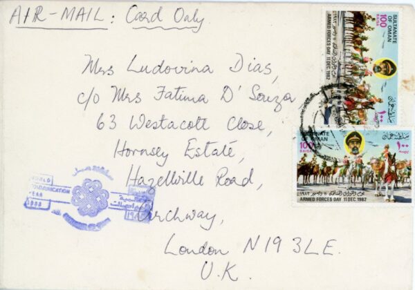 Oman: 1983 cover from Ruwi to London franked with two 100b. Armed Forces Day army band stamps. Sg. 278