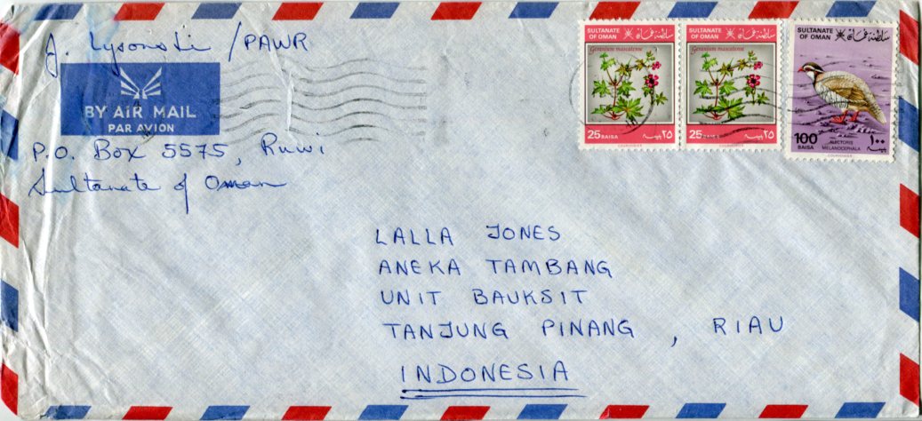 Oman: 1984 cover to Indonesia with pair of 25b Flora and 100b Bird stamps.