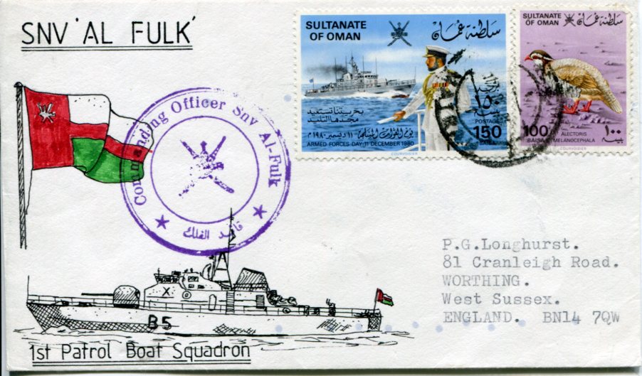 Oman: 1984 (17 August). Hand drawn 1st Patrol Boat Suadron cover to England franked with 150b Armed Forces Day and 100b Flora and Fauna stamps tied by MUTRAH datestamp and ‘Commanding Officer Snv Al-Fulk’ handcachet. Reverse blank. Mi. 206, 237 / Sg. 235, 267