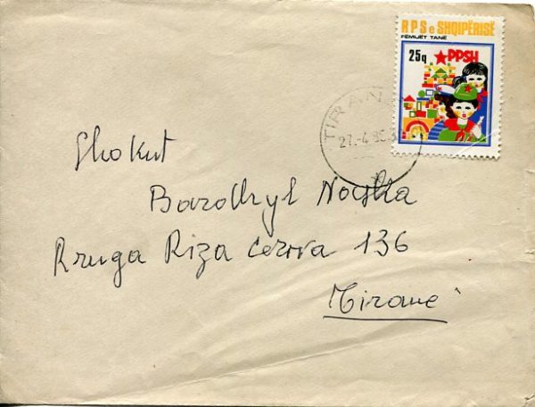 Albania: 1985 (27 April). Cover with its contents used locally franked with 25q Children commemorative stamp tied by Tirane datestamp and on reverse 29 April Tirane SH-1 cds. Sc. 2119