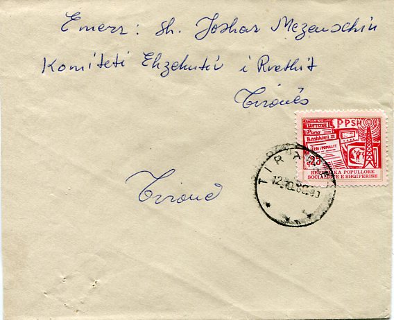 Albania: 1985 (12 October). Locally used cover franked with 25q definitive stamp tied by Tirane datestamp. Sc. 1927