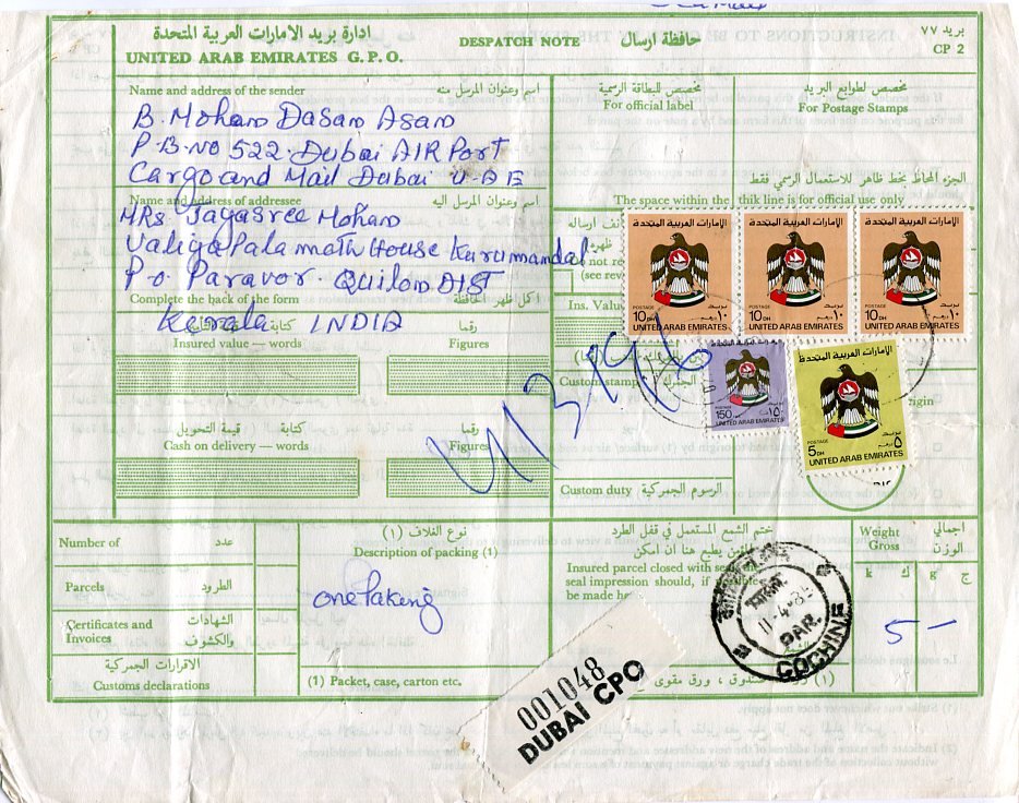 United Arab Emirates: 1985 Air Waybill to India franked with 150f, 5d and strip of three 10d coat of arms definitive stamps tied by Dubai datestamps and Cochin arrival cds.