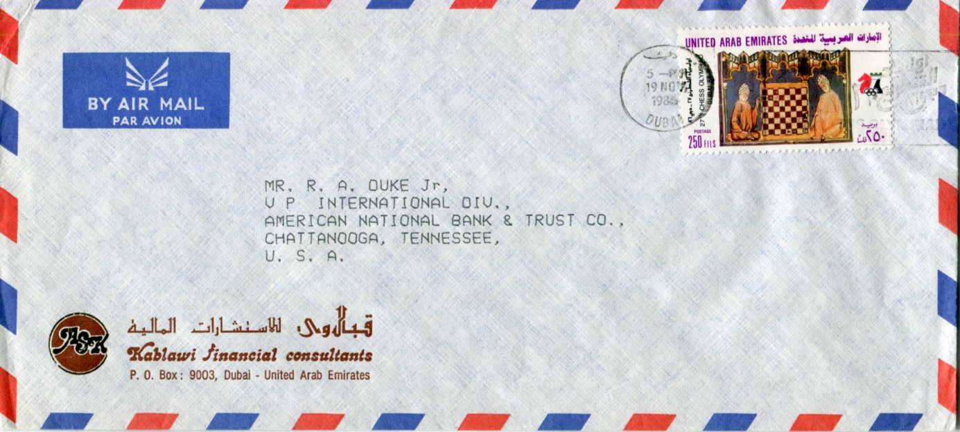 United Arab Emirates: 1985 commercial cover from Dubai to United States with 250f Chess Olympiad stamp.