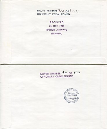Great Britain – Turkey: 1986 (25 October). British Airways Concorde First Flight London – Istanbul – London flight covers. Officially signed by crew and certified no. 80 of 100.