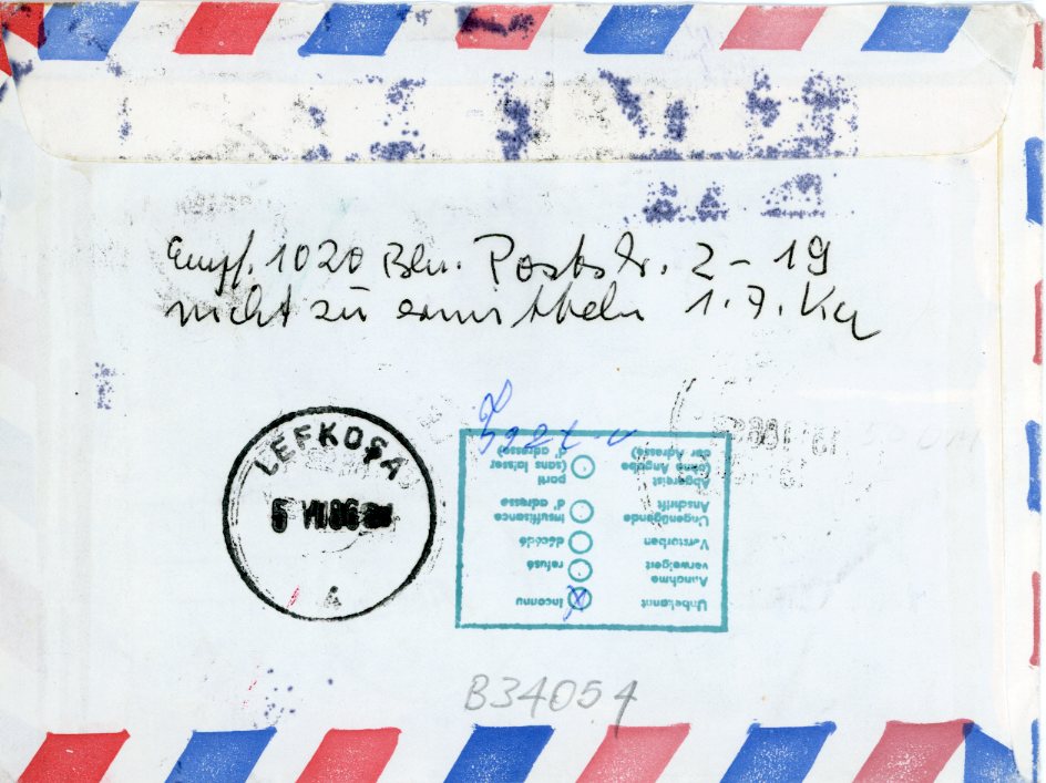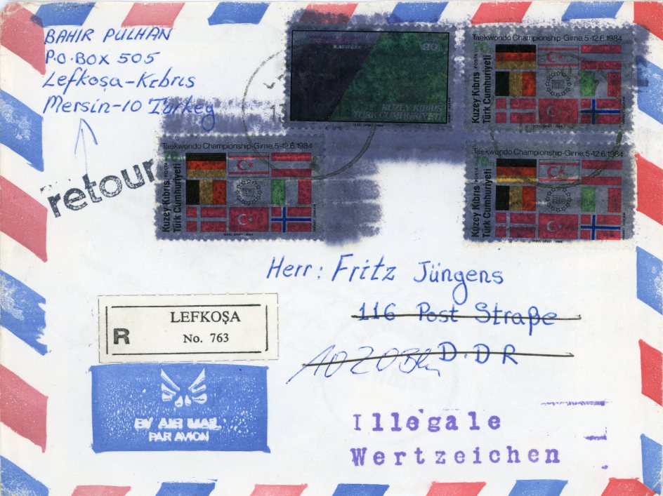 Turkish Cyprus: 1986 registered philatelic cover to East Germany franked with Turkish Cyprus stamps tied by Lefkosa (Nicosia) datestamps. Considered as illegal use and blacked out by the receiving country with two line Illegale / Wertzeichen (illegal stamps) hand cachet and return to sender with ‘retour’ and ‘Inconnu’ hand stamps. Received 6 June Lefkosa arrival cds.