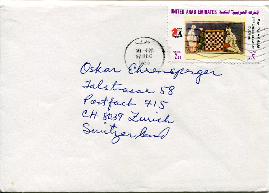 United Arab Emirates: 1986 cover to Switzerland franked with 2d Chess Olympiad (corner fault) and tied by Dubai datestamp. Sg. 211