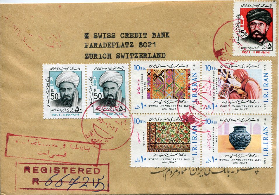 Iran: 1986s registered cover to Switzerland with block of four World Handicrafts set and portrait stamps.