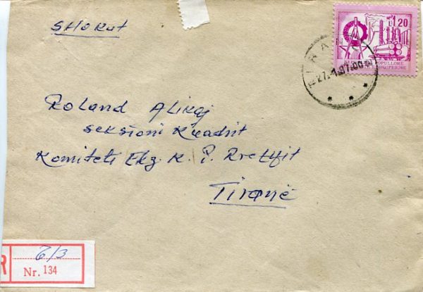 Albania: 1987 (27 January). Registered cover used locally franked with 1,20l definitive stamp tied by Tirane datestamp. Reverse same day arrival cds. Sc. 1930