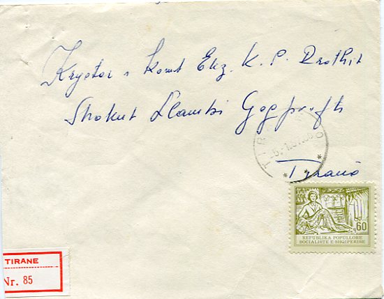 Albania: 1987 (5 January). Registered cover used locally franked with 60q definitive stamp tied by Tirane datestamp. Reverse same day arrival cds. Sc. 1928