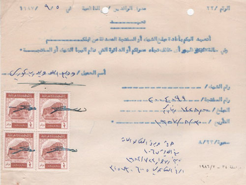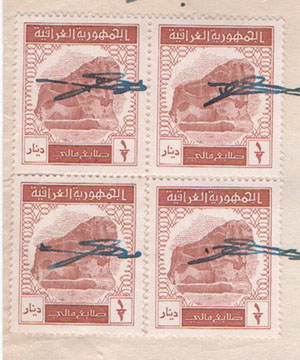 Iraq: 1987 document franked with block of four 1/2d Lion of Babylon of 1980-87 revenue stamps. Ross&Powell 337