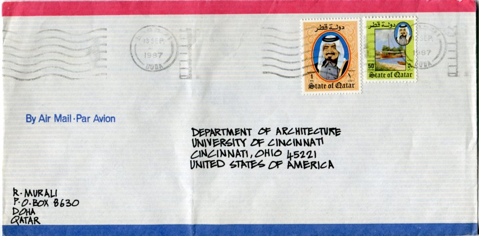 Qatar: 1987 cover from Doha to United States with 50d and 1r Sheikh Khalifa portrait definitives.