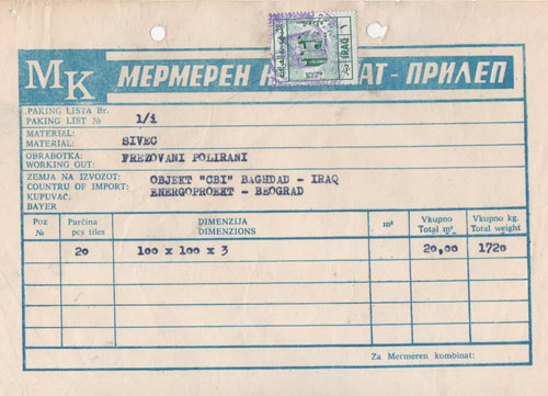 Iraq: 1987s invoice from Yugoslavia document franked with pre-cancelled 1d Gate of Ishtar Foreign Ministry of 1987 revenue stamp. Ross&Powell V-1/5