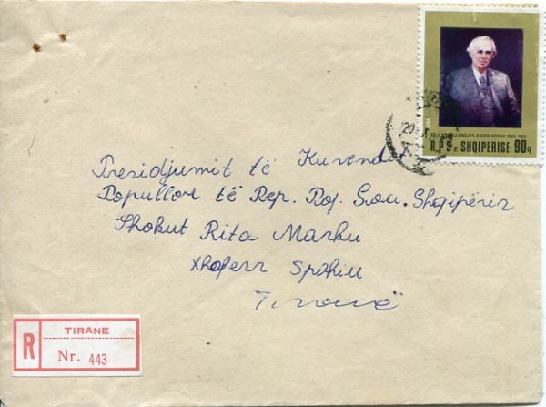 Albania: 1988 (20 October). Registered cover used in Tirane franked with 90q Enver Hoxha commemorative stamps. Sc. 2291 – Sg. 2398