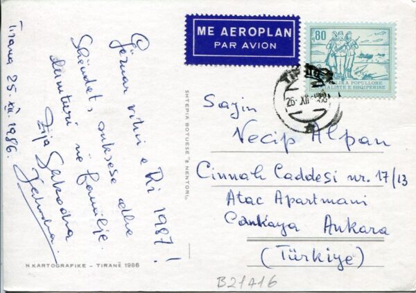 Albania: 1988 (26 December). Postcard to Ankara, Turkey franked with 80q Soldiers stamp and tied by Tirane datestamp.