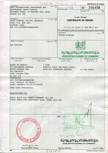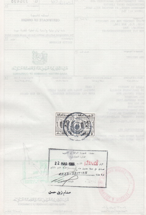 Iraq: 1988 Certificate of Origin document from United Kingdom franked with pair of 5d Gate of Ishtar Foreign Ministry of 1987 revenue stamp. Ross&Powell V-1/6