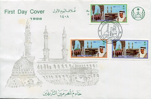 Saudi Arabia: 1988 (23 April). King Fahd, custodian of Holy Mosques in Medina and Mecca first day cover. Rust spot. Sg. 1562/1564