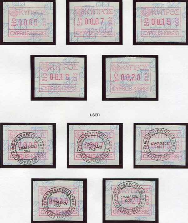 Cyprus: 1989 (29 May). Wending machine postage labels unused and first day cancel set from the machine located in district post office in Limassol.