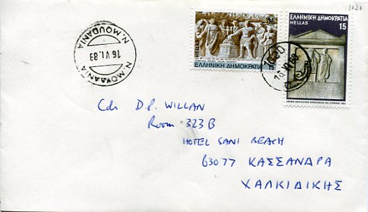 Greece: 1989 (16 June). Rural cover franked with two 15d Antiquity stamps tied by Posthorn 1020 and N. Moudania datestamps.
