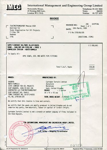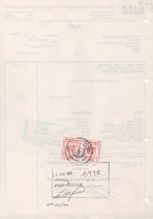 Iraq: 1989 invoice from United Kingdom document franked with pair of 1/2d Gate of Ishtar Foreign Ministry of 1987 revenue stamps. Ross&Powell V-1/4