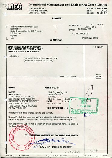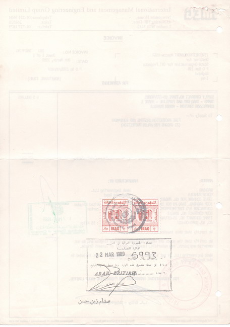 Iraq: 1989 certificate of origin invoice from London franked with pair of 1/2d of 1987 Gate of Ishtar Foreign Ministry visa stamp. Ross & Powell V-1/4
