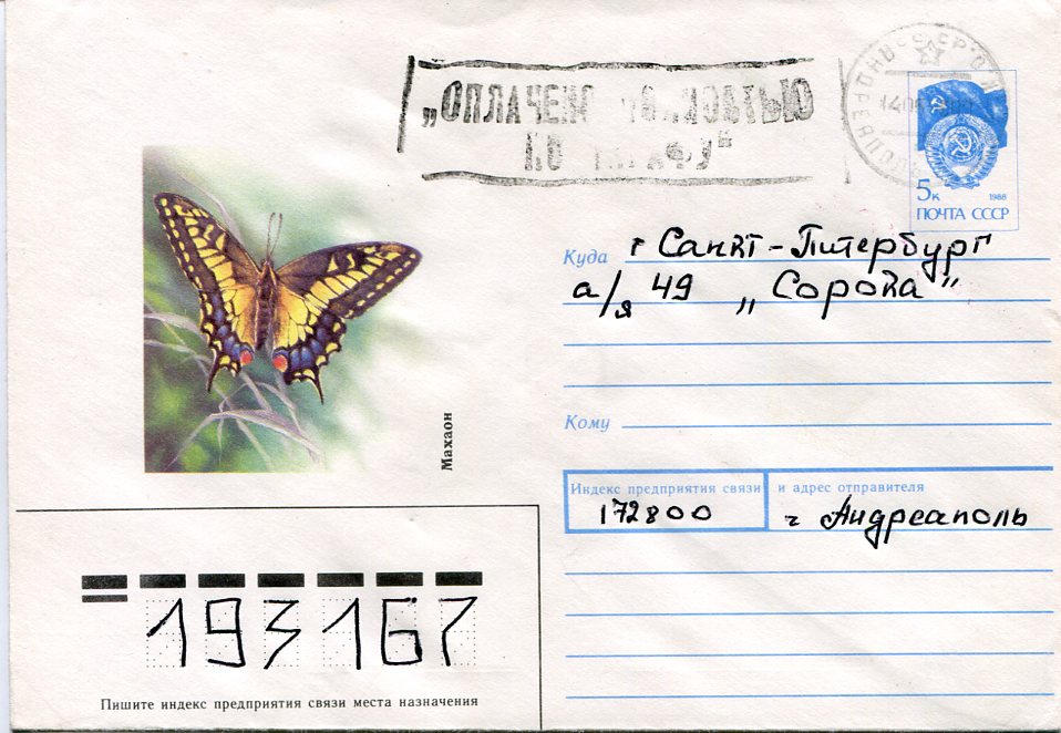 Russia: 1989 (14 May). 5k Butterfly theme postal envelope to Air Force with rate paid handcachet.