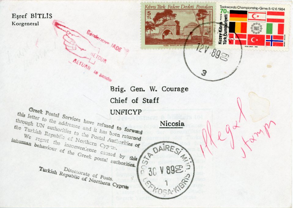 Turkish Cyprus: 1989 (12 May). Cover imprinted Eşref Bitlis / Korgeneral (Lieutenant General of the Cyprus Turkish Peace Forces) franked with Turkish Cyprus stamps tied by Girne datestamp addressed to UNFICYP Chief of Staff, Nicosia. It has been refused for delivery endorsed illegal stamps in red and return to sender and received 30 May Lefkosa arrival cds.