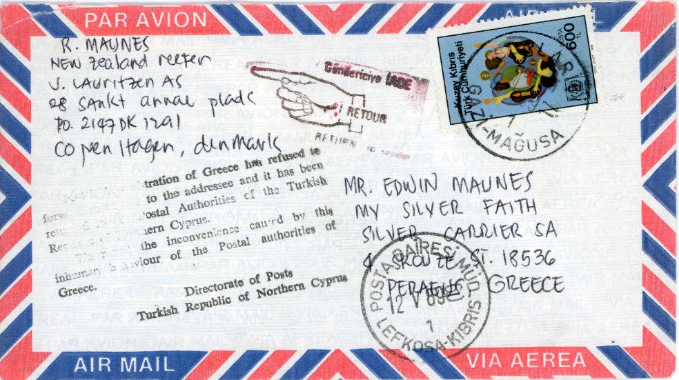 1989 Turkish Cyprus Famagusta to Greece Refused and Returned