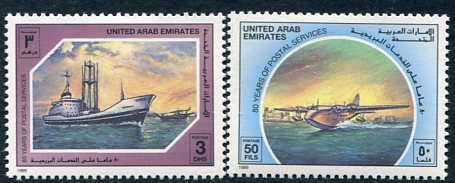 United Arab Emirates: 1989 (19 August). 80 Years of Postal Service – Ship, Aeroplane unmounted mint set. Mi. 269/270, Sg. 270/271