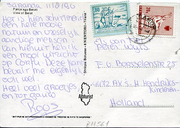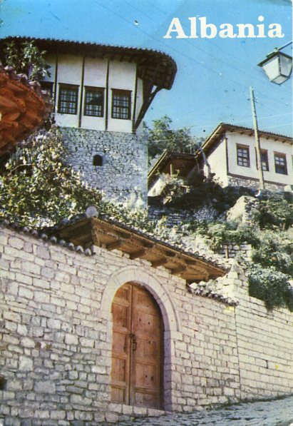 Albania: 1990 (14 August). Picture postcard of Berat to Netherlands franked with 20q and 80q definitive stamps tied by Saranda datestamp.
