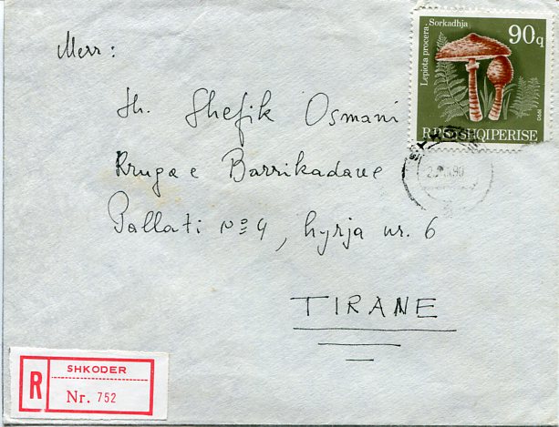 Albania: 1990 (22 December). Registered cover used inland franked with 90q Mushroom stamp tied by Shkoder datestamp and reverse next day Tirane arrival cds. Sc. 2341