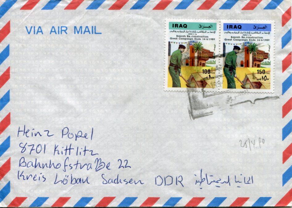 Iraq: 1990 (25 March). Completion of Basrah Re-construction Project set on cover from Mosul to Germany. Sg. 1873/1874
