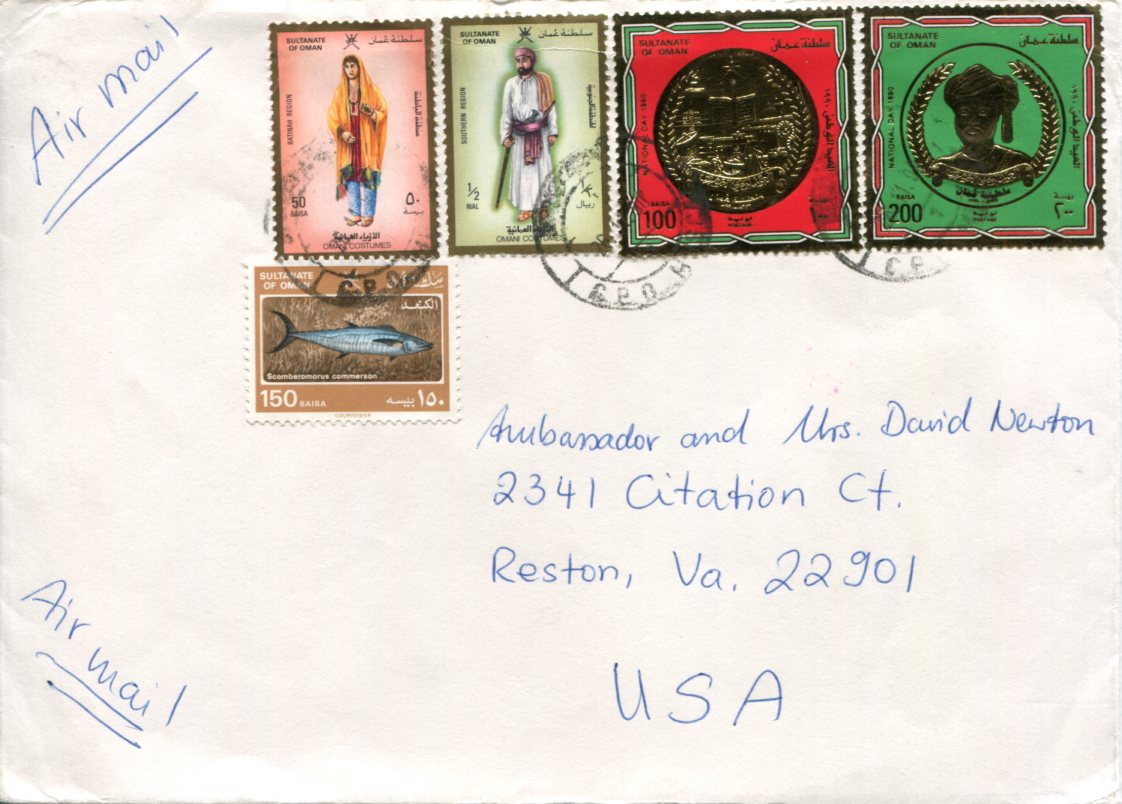 Oman: 1990 (26 November). Cover to United States franked with 50b and 1/2d costumes, 150b fish and 1990 National Day set tied by dispatch cds’s. Sg. 318, 365, 371, 386/87