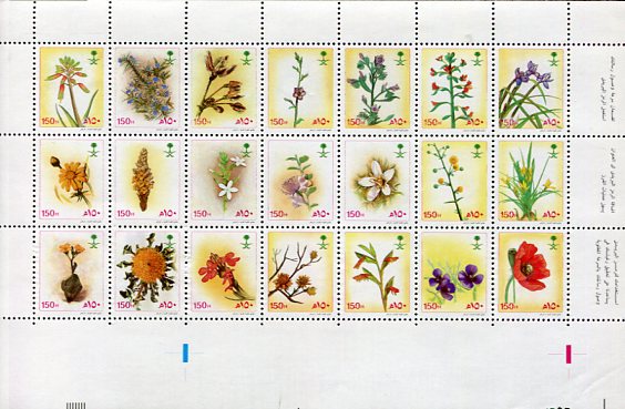 Saudi Arabia: 1990 Flowers issue 150h later printing on thicker special stamp paper unmounted mint pane of 21. See note after Mi. 964/1026