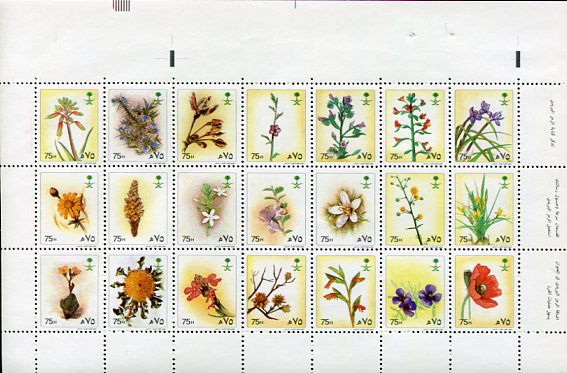 Saudi Arabia: 1990 Flowers issue 75h later printing on thicker special stamp paper unmounted mint pane of 21. See note after Mi. 964/1026