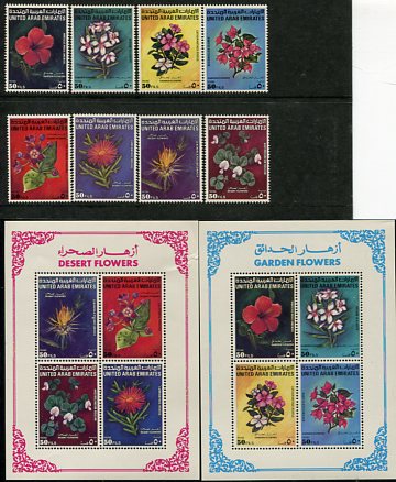 United Arab Emirates: 1990 (25 August). Flowers unmounted mint set and miniature sheets. Mi. 308/315 + Blocks 7, 8 –  Sg. 312/319, MS320