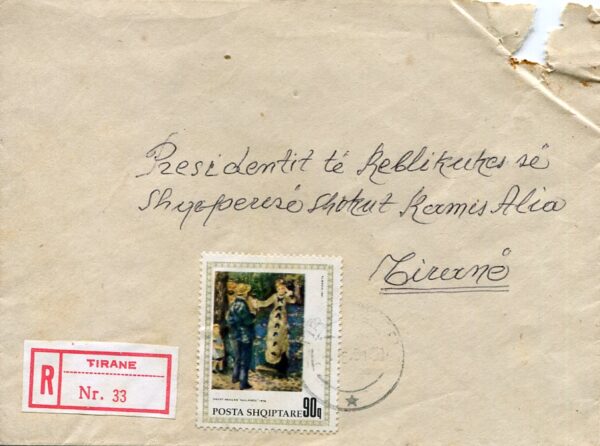 Albania: 1991 registered cover used in Tirana franked with 90q Renoir painting commemorative tied by Tirane datestamp. Sg. 2488