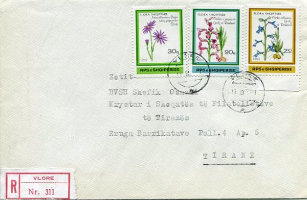 Albania: 1991 (19 September). Registered cover written from Hotel Turizmi, Vlore to Tirana franked with complete set of 1989 Flowers stamps. Sc. 2307/2309