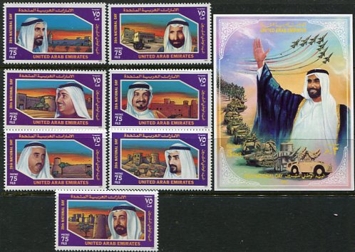 United Arab Emirates: 1991 (2 December). National Day unmounted mint set and miniature sheet. Mi. 355/361 + Block 10 – Sg. 361/367, MS368