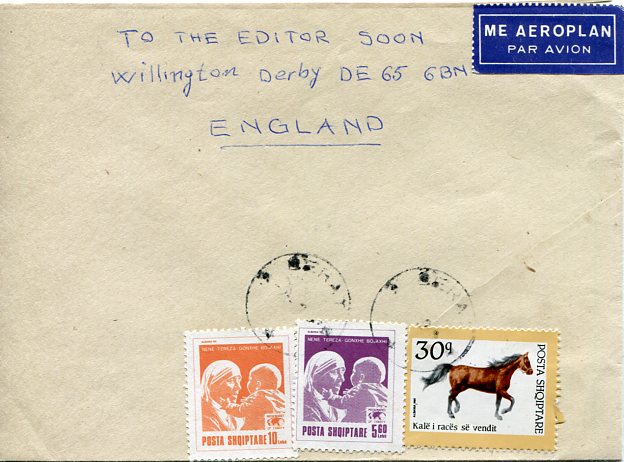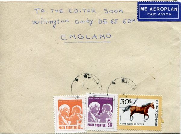 Albania: 1992 cover to England franked with 5,60l and 10l Mother Theresa definitive and 30q Horses commemorative stamps tied by Berat datestamps. Sc. 2417, 2431, 2433 – Sg. 2531, 2546, 2548