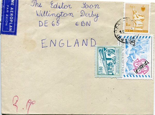 Albania: 1992 (14 September). Cover to England franked with 1,60l and 6l definitive and 90q Europa Cept commemorative stamps tied by datestamp and on reverse Librazhd cds. Sc. 1931, 2234, 2404 – Sg. 1986, 2340, 2518