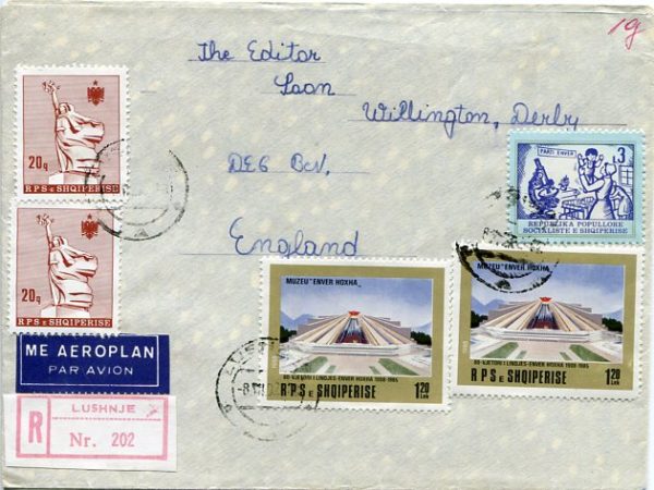 Albania: 1992 (8 July). Registered cover to England franked with two 20q definitive, two 1,20l Enver Hoxha Museum and 3l Medicine commemorative stamps tied by Lushnje datestamps. Sc. 1932A, 2224, 2292