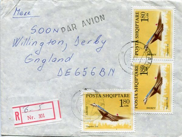 Albania: 1992 (September). Registered cover to England franked with single and a pair of 1,80l Aircrafts and on reverse pair of 20q definitive stamps tied by Tirane datestamps. Sc. 2224, 2393 – Sg. 2330, 2510