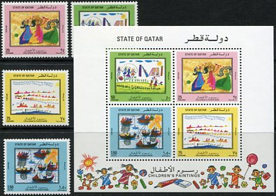 Qatar: 1992 (15 June). Children’s Paintings unmounted mint set and miniature sheet. Mi. 9987/990 + Block 26, Sg. 891/894 + MS895